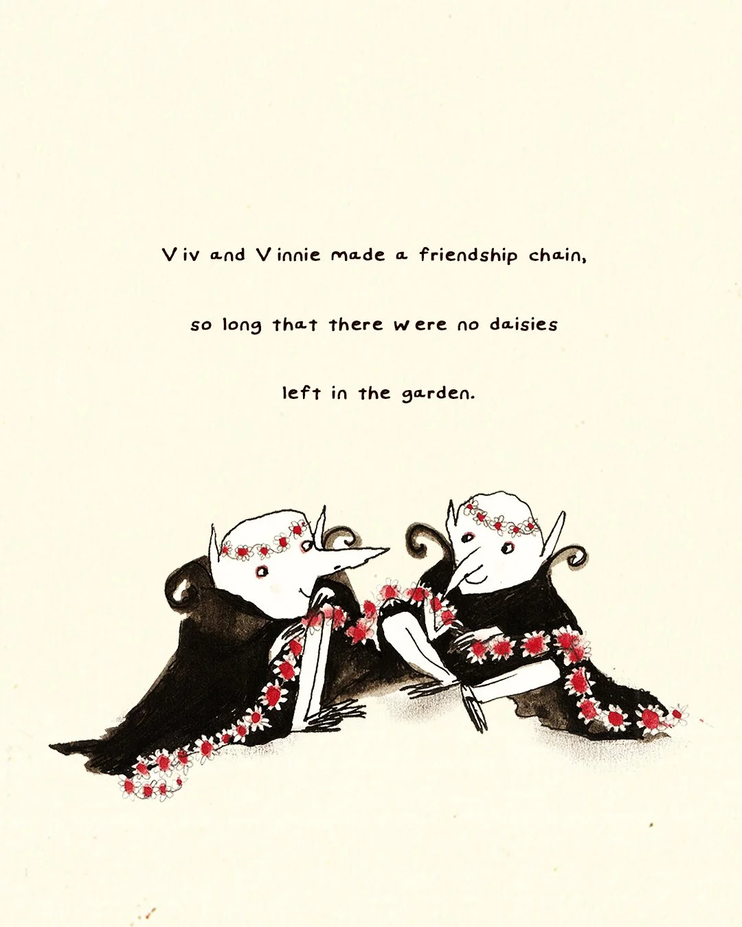 Viv and Vinnie made a friendship chain, so long that there were no daisies left in the garden.